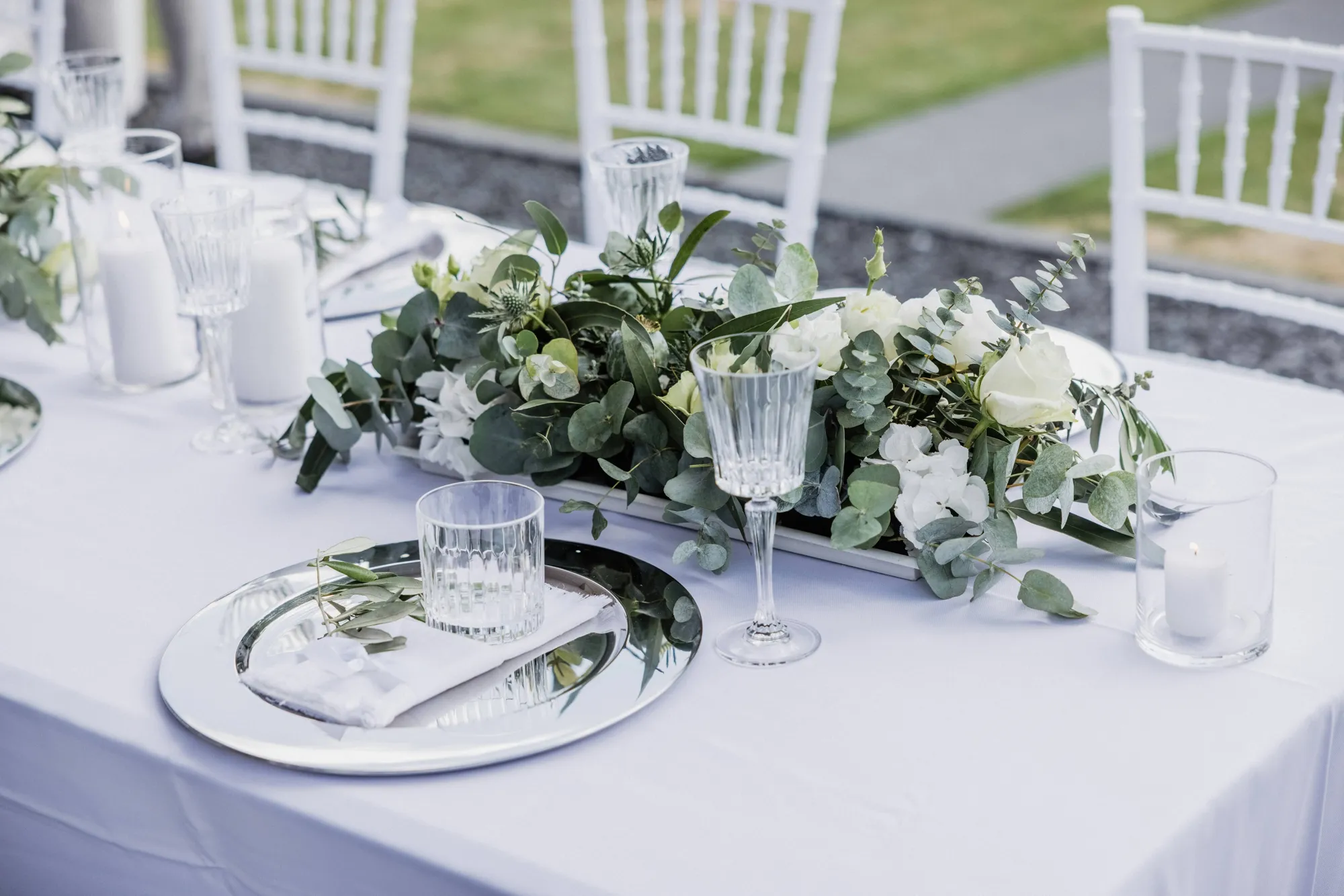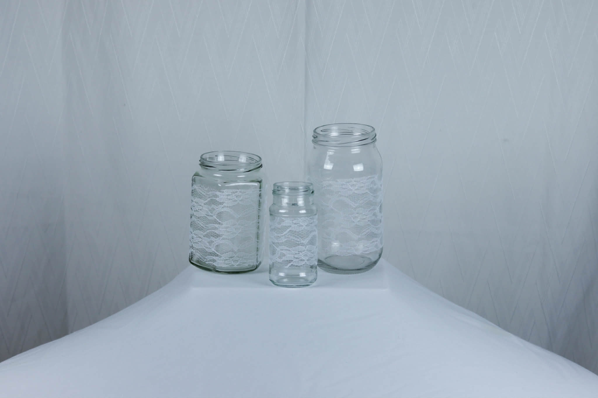 Ljuslyktor med spetskant, som med fördel kan fyllas med dekorsten i färgerna för ditt evenemang.